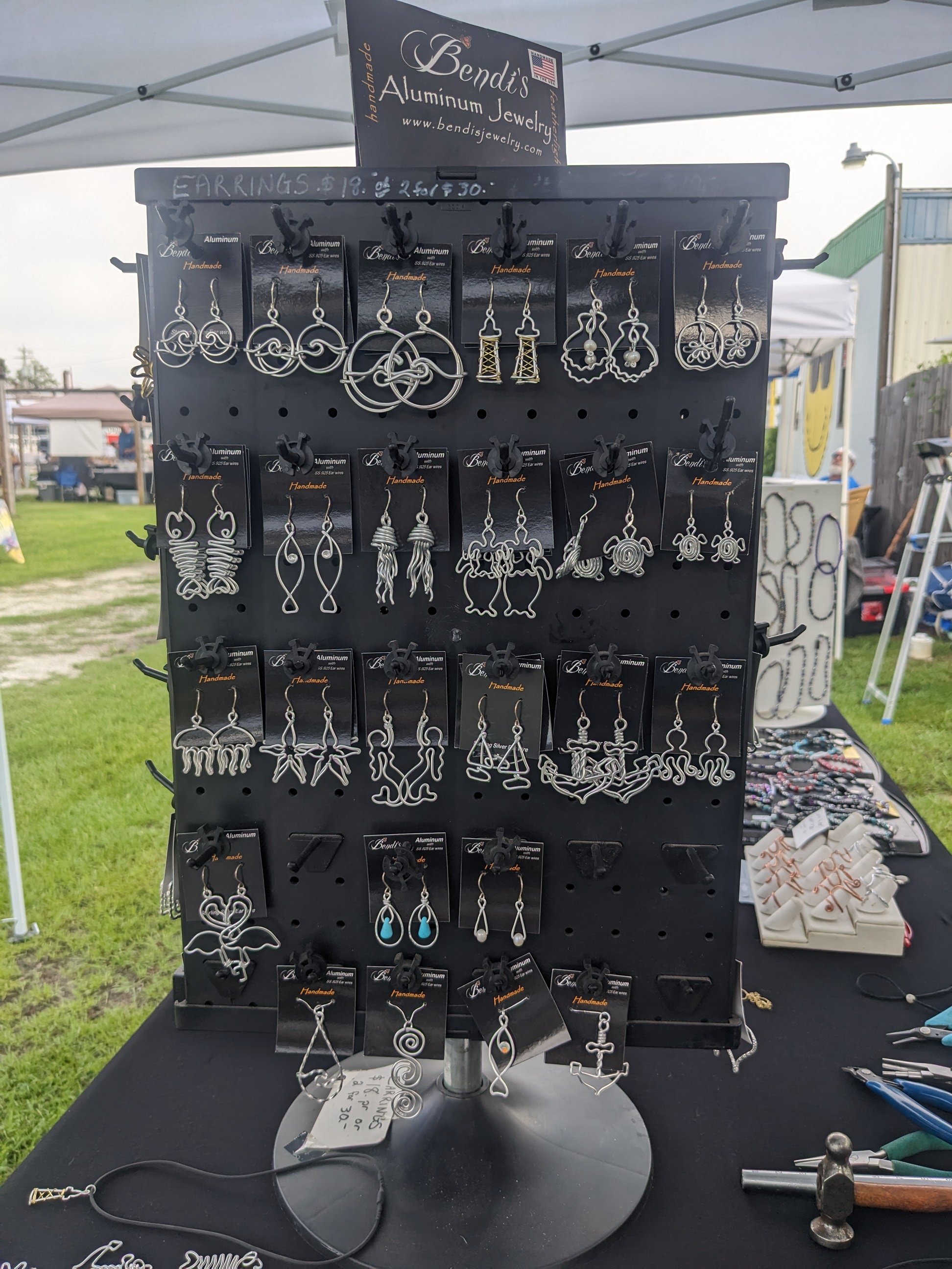 My name is Cyndi Jones and I bend wire into shapes inspired by the beach, nature, holidays, and more. I create my art with anodized aluminum wire which is feather-light and very easy to take care of. (I like to use toothpaste to clean both the aluminum and the sterling silver ear hooks.) I use basic hand tools and most of my art is made using one continuous piece of wire. Each piece is made by hand and is unique.